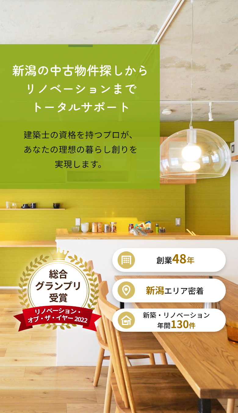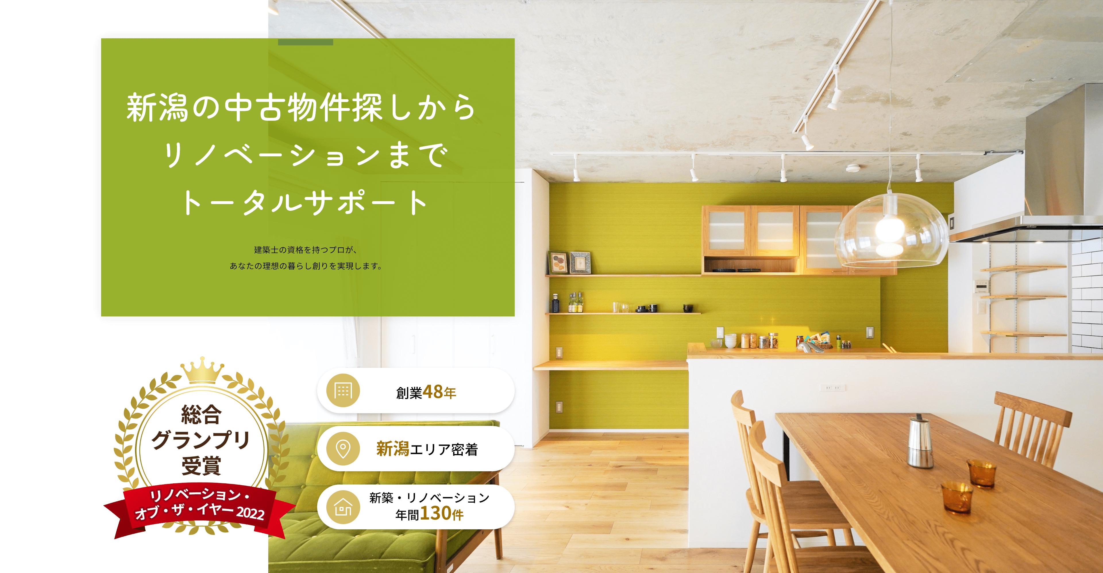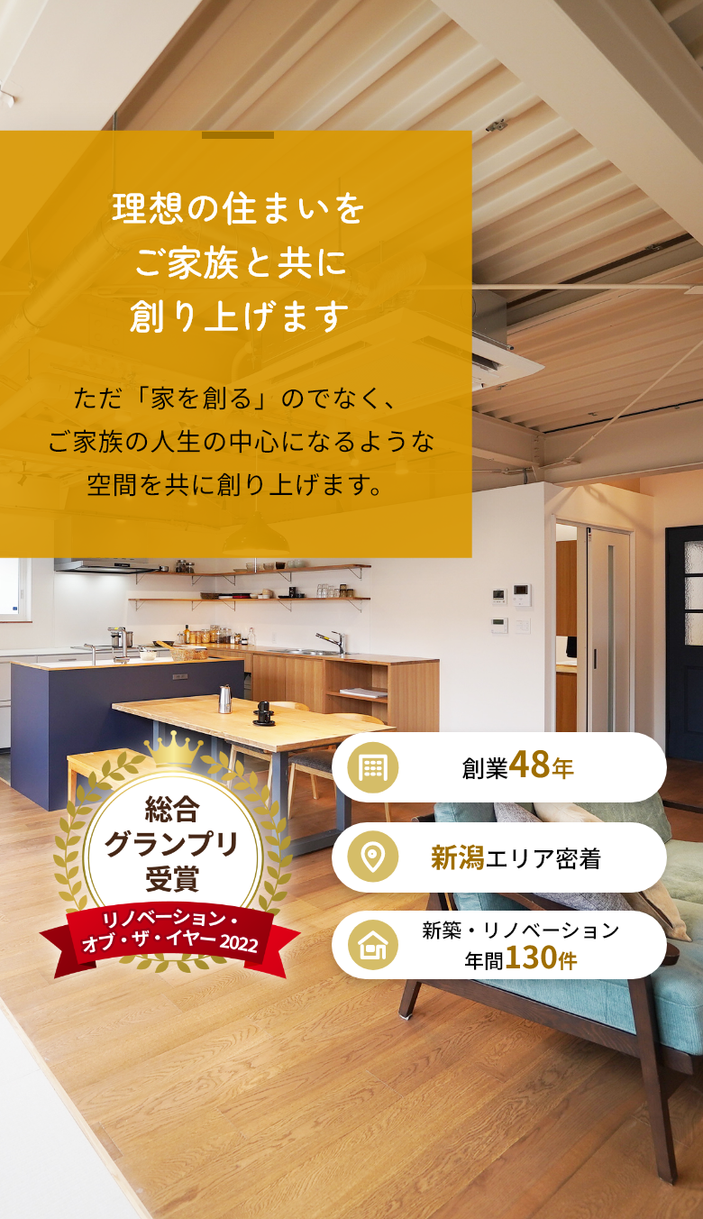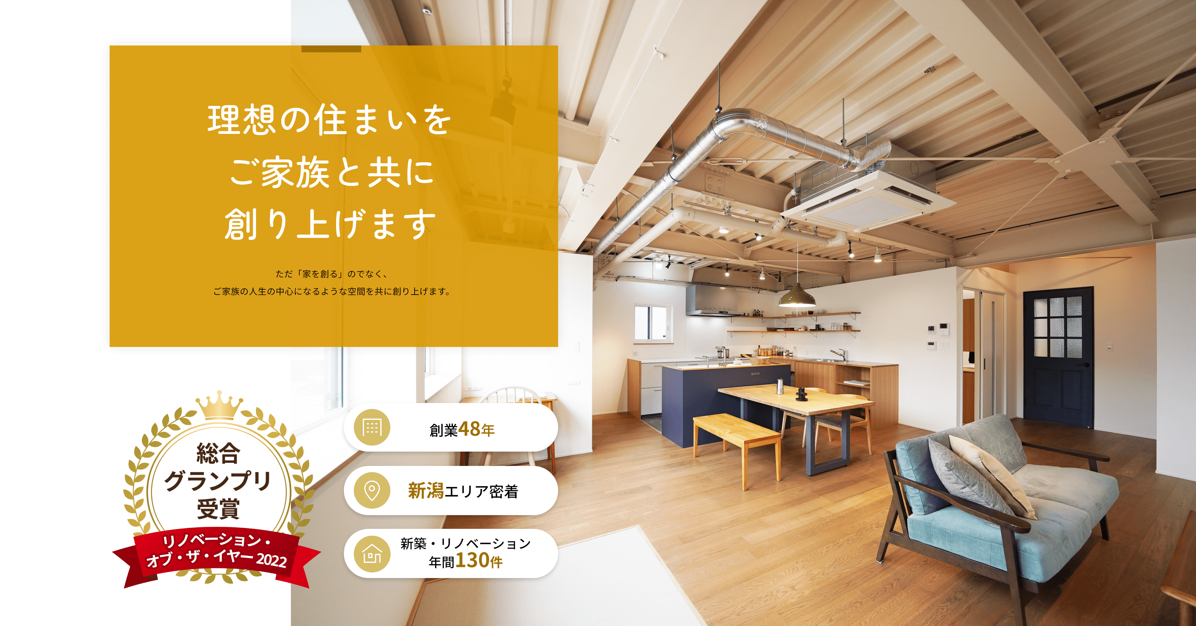 創業から48年、新潟の地を深く理解し、その環境に対応してきた実績であなたの理想の暮らしを実現します。 確かな技術とご家族の想いを汲み取り、楽しみながら想像を超えるリノベーションをご提案します。