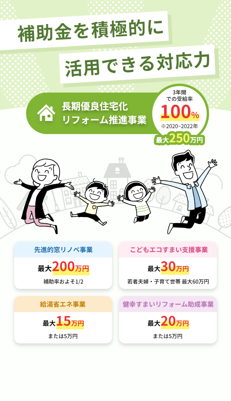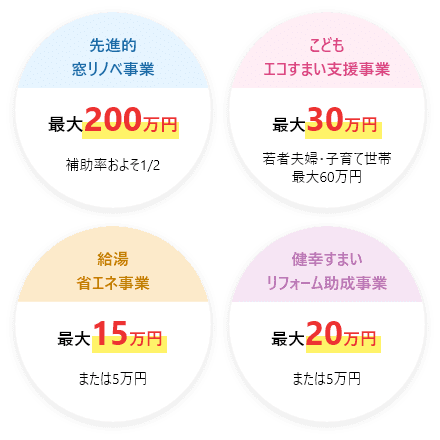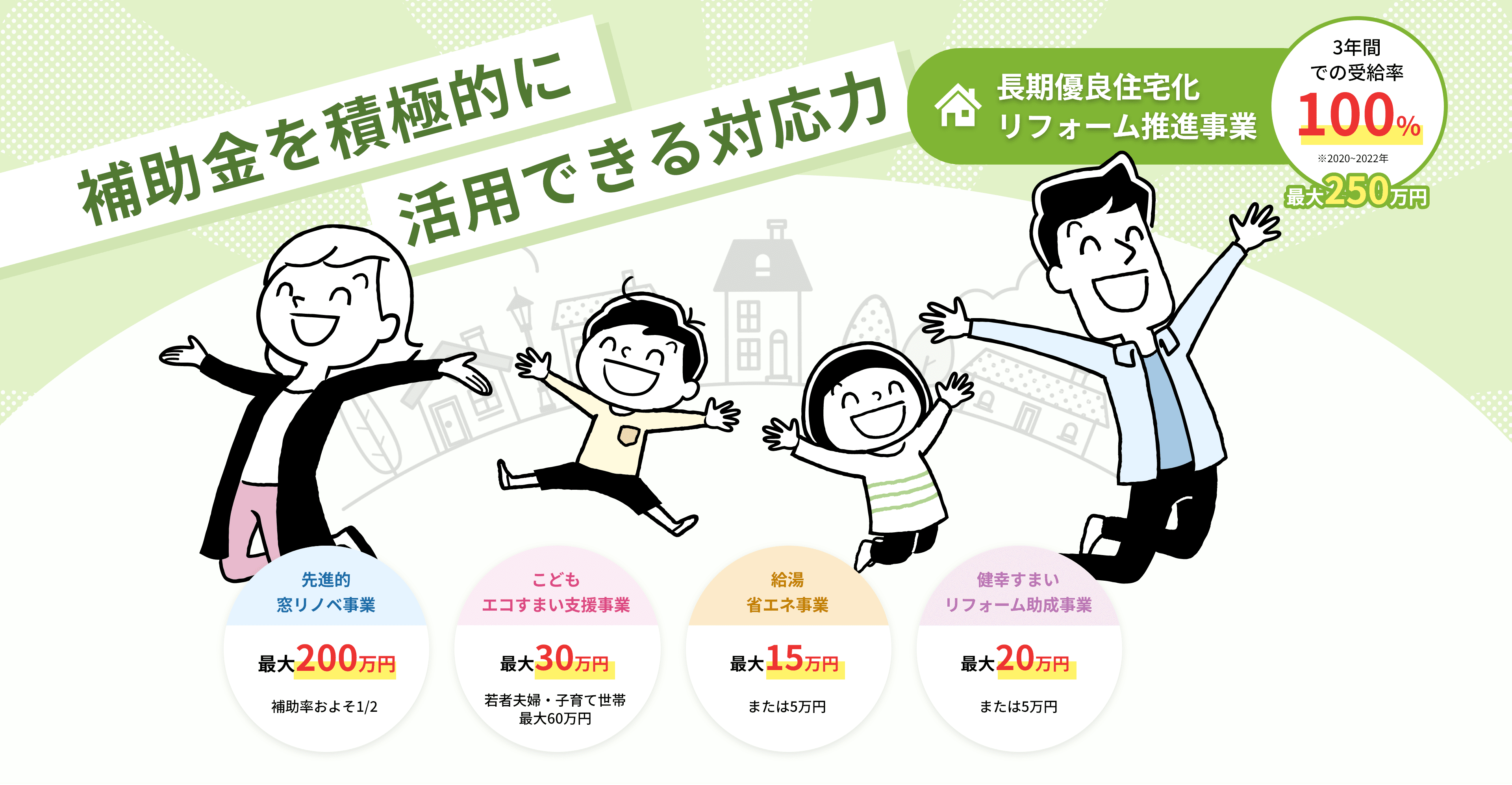 長期優良住宅化リフォーム推進事業、先進的窓リノベ事業、こどもエコ住まい支援事業、 給湯省エネ事業に合わせて地域で行っている健幸すまいリフォーム助成事業など 幅広い補助金が活用できます。